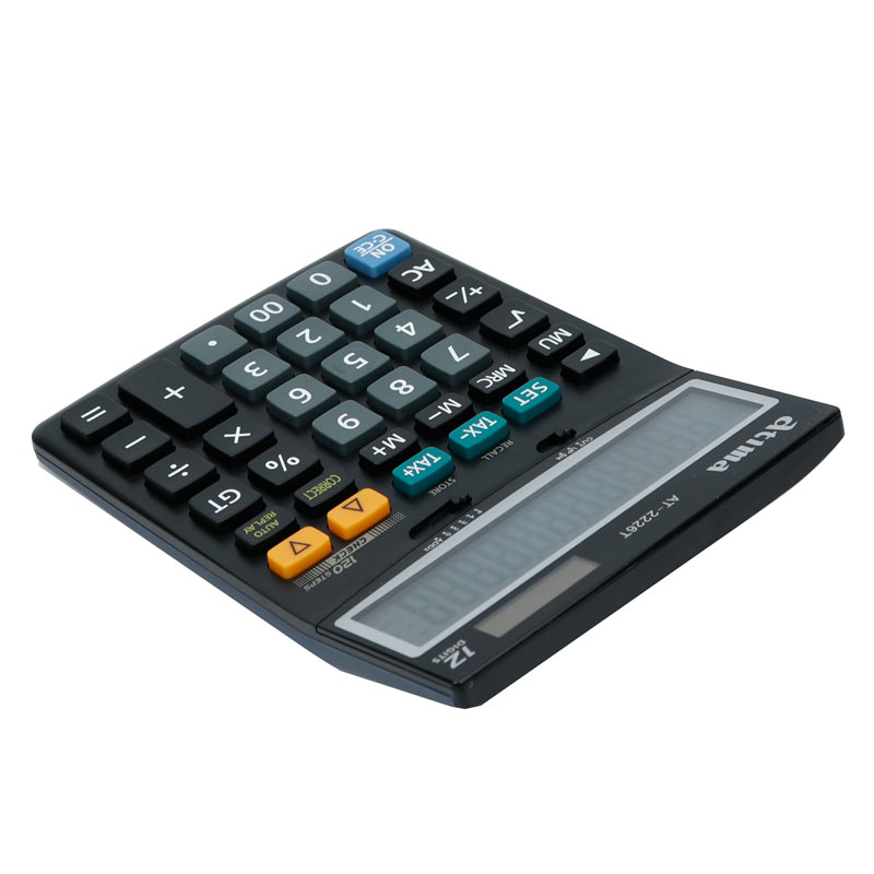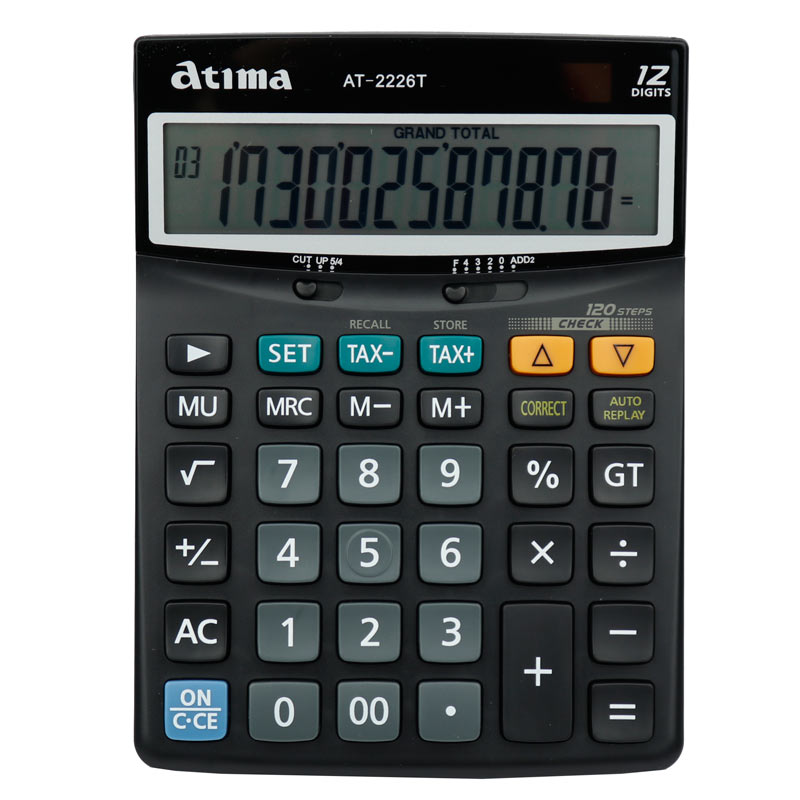 کلید های مقاوم پلاستیکی نرم با بدنه ای خوش ساخت نمایشگر خطی بزرگ با نمایش ۱۲ رقم منبع تغذیه از طریق باتری و انرژی خورشیدی دارای کلید های حافظه، MU و کلید نمایش جمع کلی از نتایج محاسبات قبلی (GT) امکان بررسی و اصلاح تا ۱۲۰ مرحله پشتیبانی از نمایش خودکار مراحل محاسبه و تصحیح عدد اشتباه وارد شده در محاسبات با ارقام طولانی امکان انتخاب نوع گرد کردن اعداد و مشخص نمودن تعداد اعشار محاسبات پشتیبانی از اجرای محاسبات درصدی، آماری و مالیاتی با دکمه های -TAX+ ،TAX و SET مجهز به کلید دو صفر و مناسب مصارف تجاری، فروشگاهی و ... طراحی زیبا و ابعاد متناسب جهت حمل آسان