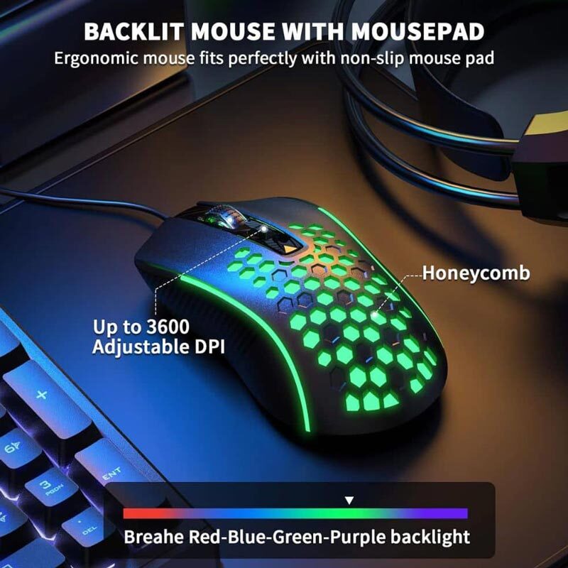 شامل یک عدد کیبورد باسیم گیمینگ، یک عدد موس گیمینگ با طراحی ارگونومیک، هدست سیمی و موس پد با زیره لاستیکی ضد لغزش