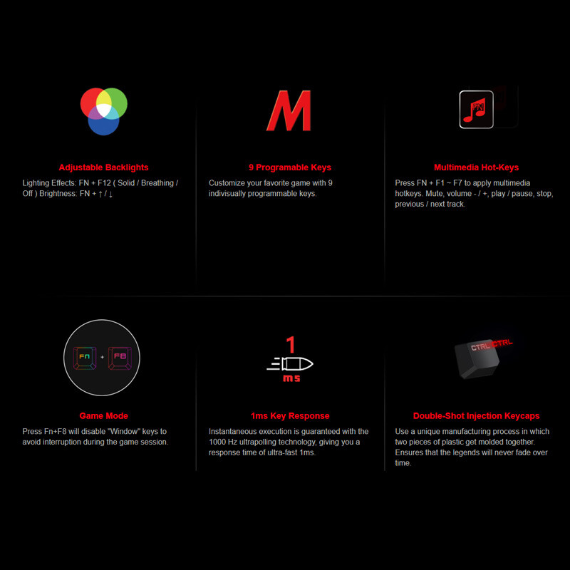 بهره مندی از 109 کلید فیزیکی شامل کلیدهای مولتی مدیا و FN و...، دارای 9 کلید قابل برنامه ریزی ماکرو