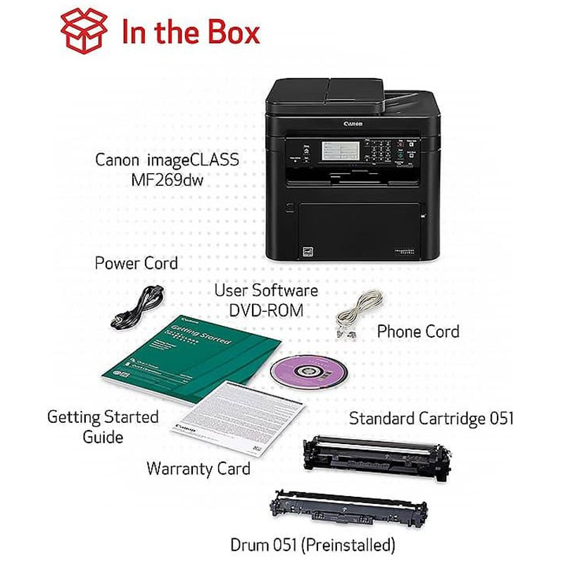 پرینتر چند کاره لیزری کانن Canon imageCLASS MF269dw با فناوری چاپ لیزری و تک رنگ از قابلیت پرینت، کپی، اسکن و فکس پشتیبانی می کند و برای مصارف خانگی و محیط های اداری مناسب می باشد. این چاپگر از بدنه ای مقاوم در برابر صدمات احتمالی ساخته شده و ظرفیت ورودی سینی کاست کاغذ آن قابلیت نگهداری ۲۵۰ برگ را دارد. همچنین به سینی ورودی چند منظوره تک برگ و قابلیت تغذیه خودکار کاغذ با ظرفیت حدود ۵۰ برگ نیز مجهز می باشد.