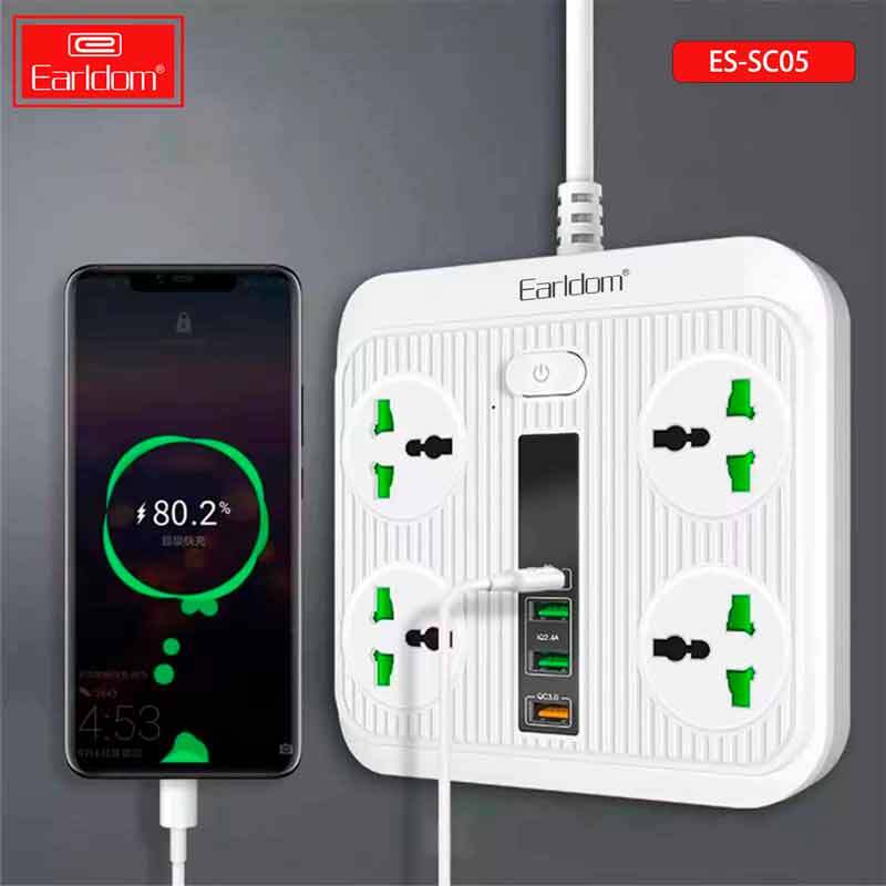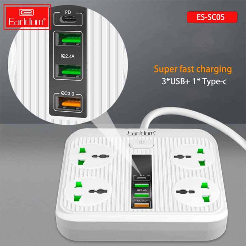 چند راهی 4 خانه ارلدام ES-SC05 با کابل 2 متری + شارژر USB و Type-C