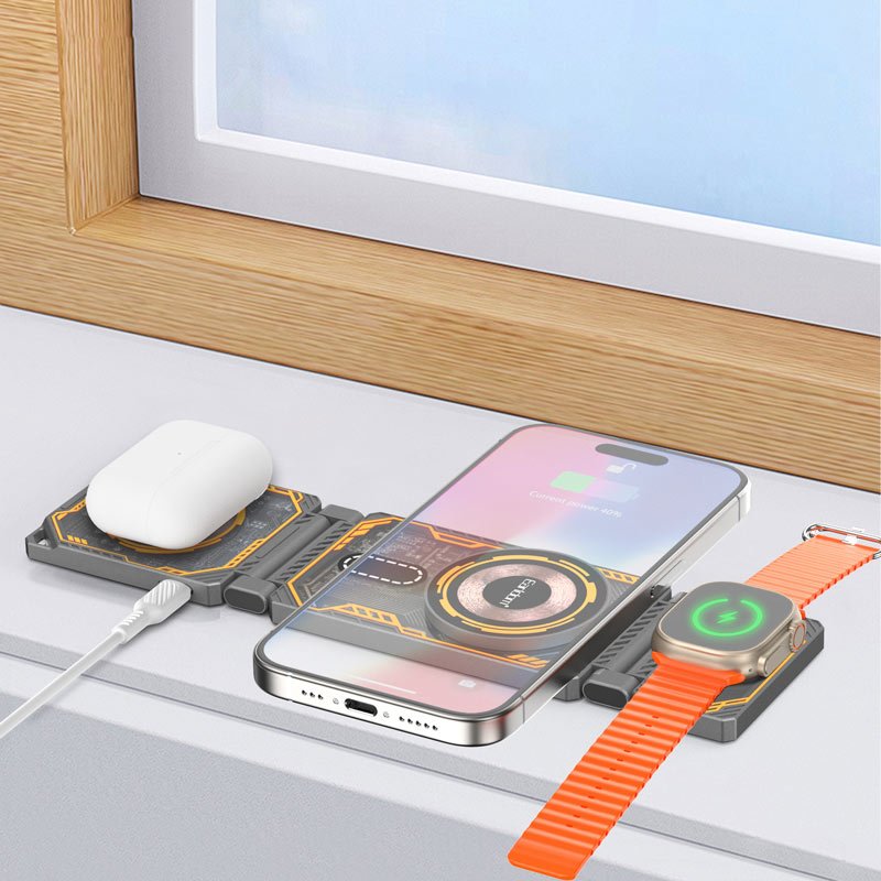 مجهز به سه عدد پد شارژ وایرلس مناسب برای سه گجت هوشمند شامل گوشی موبایل، ساعت هوشمند و کیس هندزفری