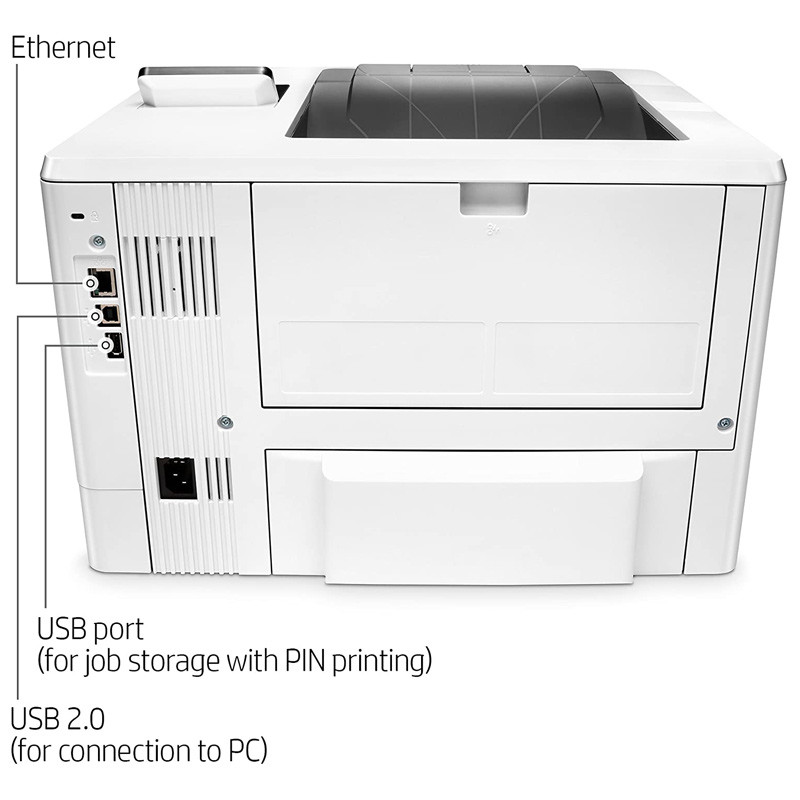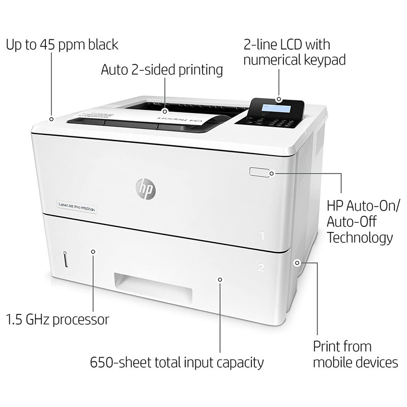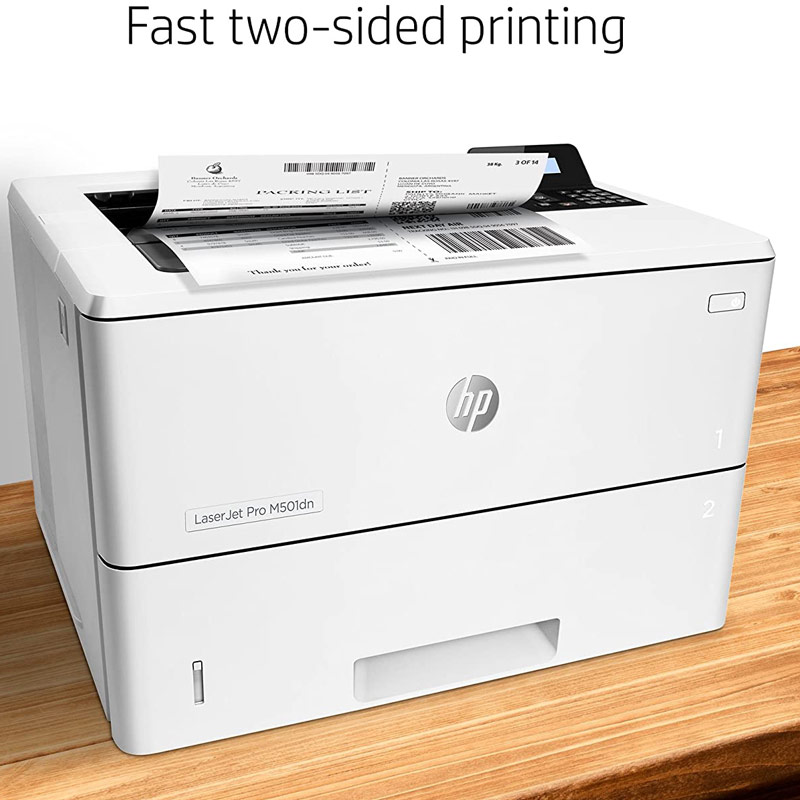 پرینتر LaserJet Pro M501dn ساخت شرکت HP، یک چاپگر با قابلیت پشتیبانی از فناوری چاپ لیزری و پرینت به صورت سیاه سفید تک رو و دو رو است. این دستگاه یک پرینتر پر سرعت و قدرتمند با سرعت چاپ ۴۳ برگ در دقیقه بوده و با این توان، پاسخگوی استفاده در حجم کاری بالا و مصارف اداری می باشد. حداکثر سایز چاپ این پرینتر بر روی کاغذ با ابعاد A4 بوده و بر روی انواع جنس های کاغذ مانند کاغذ معمولی، کارت پستال، کاغذ رنگی و … توانایی چاپ دارد. پرینتر اچ پی مدل M501dn توان چاپ ماهانه تا ۱۰۰۰۰۰ برگ با رزولوشن ۱۲۰۰*۱۲۰۰ dpi را دارد، علاوه بر این مجهز به چاپ دو رو اتوماتیک است. به این معنا که در فرایند چاپ دو رو، نیازی به دخالت دست برای پشت و رو کردن برگه ها ندارد. پرینتر LaserJet Pro M501dn با بهره مندی از کارتریج استارتر HP 87A مشکی با کارکرد ۹۰۰۰ برگ عملکرد بالایی دارد که نشان دهنده قدرت این دستگاه است. همچنین قابلیت اضافه کردن دو سینی کاغذ با ظرفیت های ۱۰۰ و ۵۵۰ برگ با مجموع ۶۵۰ را داشته، که موجب بالا بردن سرعت و توان چاپ پرینتر می شود. این پرینتر برای اتصال به کامپیوتر دارای یک پورت USB 2.0 و Ethernet است و اگرچه قابلیت اتصال بی سیم با سایر دستگاه ها را ندارد اما از فناوری HP ePrint پشتیبانی می کند. به این صورت که از دستگاه های مختلف امکان ارسال فایل عکس و متن بدون نیاز به حضور در کنار پرینتر وجود دارد. این مدل از پرینتر HP دارای یک صفحه نمایش با نور پس زمینه دو خطی و کلیدهای فیزیکی برای راحتی بیشتر کار با دستگاه نیز می باشد.