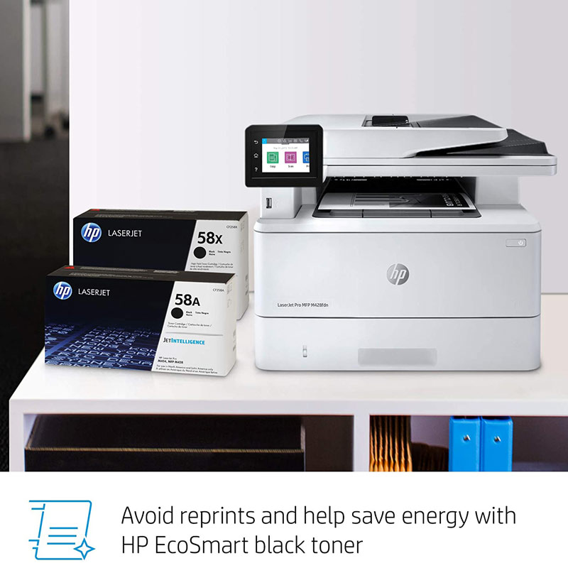 پرینتر چند کاره لیزری اچ پی مدل M428fdn با ظرفیت حافظه داخلی ۵۱۲ مگابایت، سرعت چاپ ۴۰ برگ در یک دقیقه را به صورت سیاه و سفید و با رزولوشن ۱۲۰۰x1200 dpi انجام می دهد که خوانایی و کیفیت خوبی برای چاپ متن، تصاویر گرافیکی، اسناد و ... می باشد. این چاپگر به قابلیت تغذیه خودکار ADF نیز مجهز است که با ظرفیت سینی ۵۰ برگ به طور اتوماتیک و بدون نیاز به گذاشتن دستی کاغذ عملیات های چاپ و اسکن را به خوبی و با سرعت انجام می دهد. همچنین این پرینتر از قابلیت چاپ دو رو نیز پشتیبانی می کند که از این طریق در زمان و مصرف کاغذ صرفه جویی خواهد شد. پرینتر مدل LaserJet Pro MFP M428fdn با دو نوع کارتریج سازگاری دارد که ماندگاری کارتریج CF259A آن، حداکثر ۳۰۰۰ برگ و کارایی کارتریج CF259XC آن نیز برای ۱۰۰۰۰ صفحه کاغذ دوام می آورد.