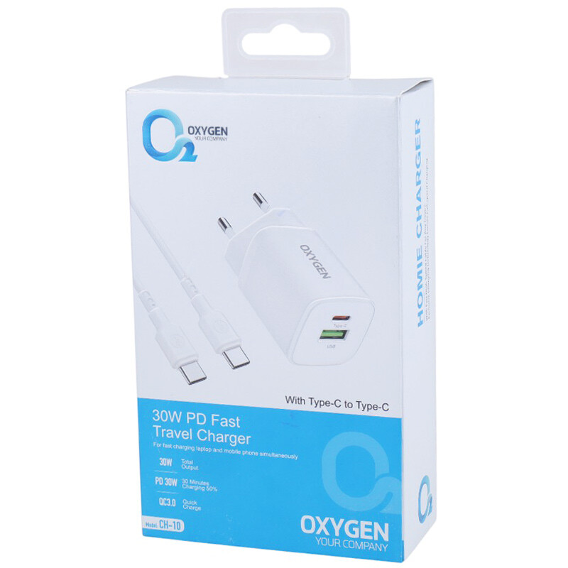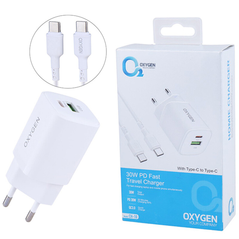 Oxygen CH-10 PD QC3.0 3A 30W Fast Wall Charger With Type-C To Type-C Cable