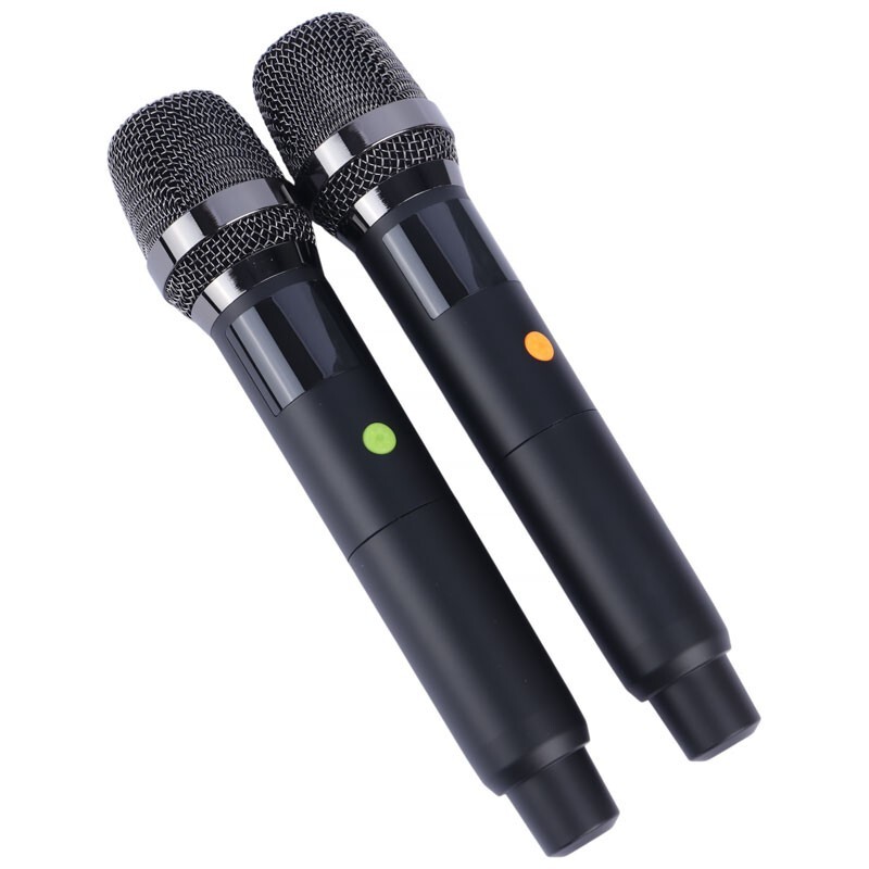 مجهز به 2 عدد درگاه میکروفون، اقلام همراه شامل 2 عدد میکروفون بی سیم و ریموت کنترل